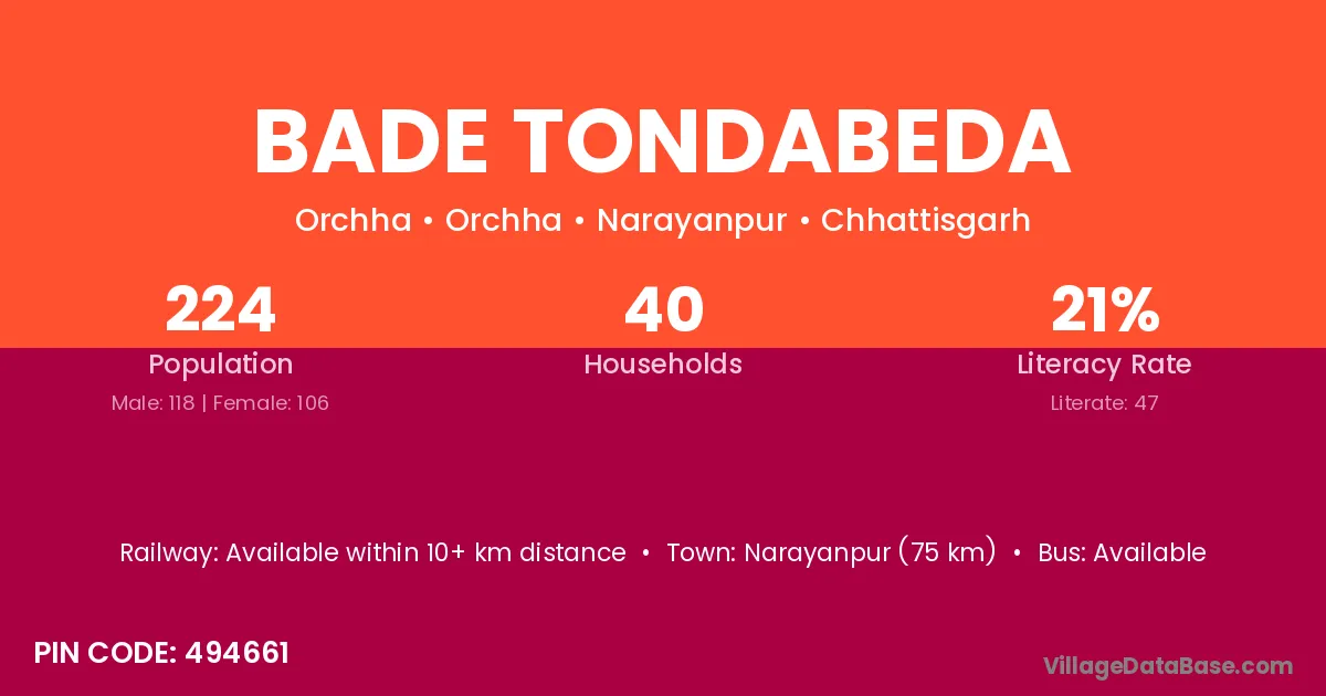 Narayanpur (75 km) is the nearest town to Bade Tondabeda village for major economic activities and is located approximately 75 km away.