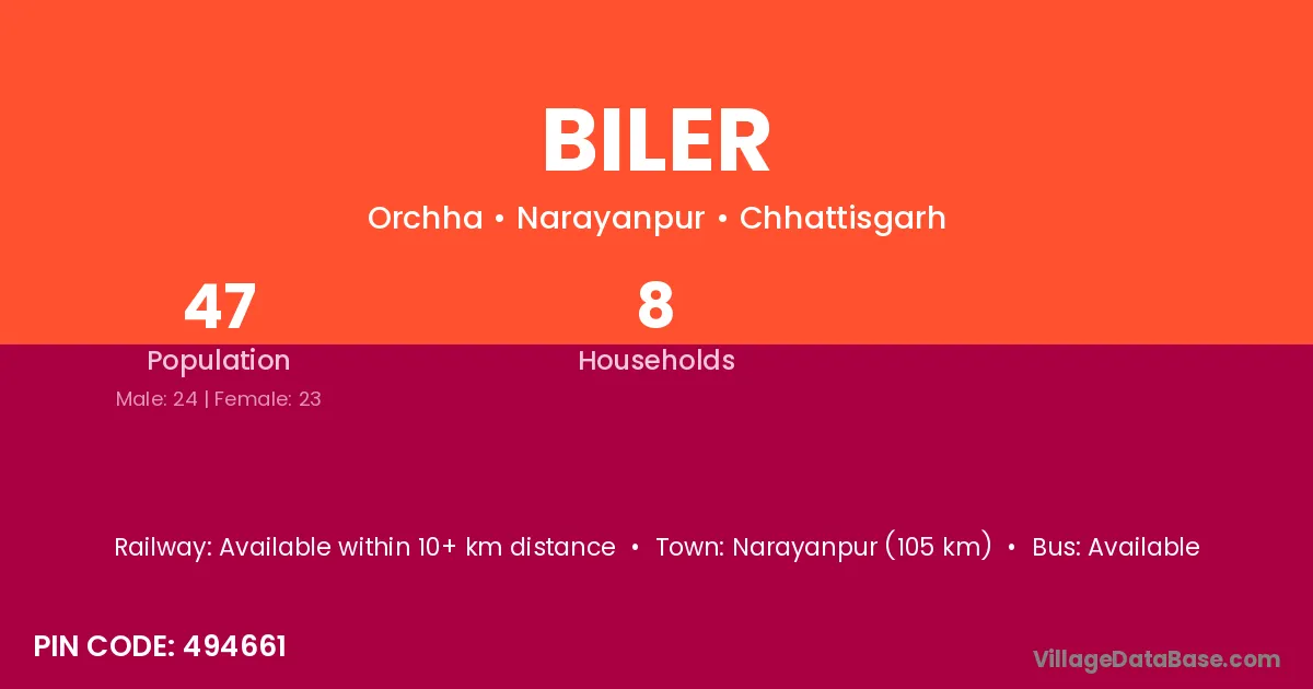 Biler village has a total population of 47 people, of which 24 are males and 23 are females.