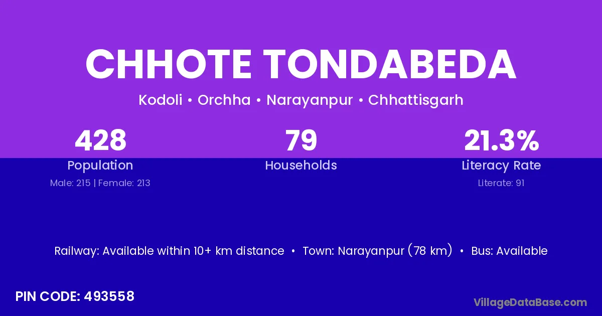 Chhote Tondabeda village has a total population of 428 people, of which 215 are males and 213 are females.