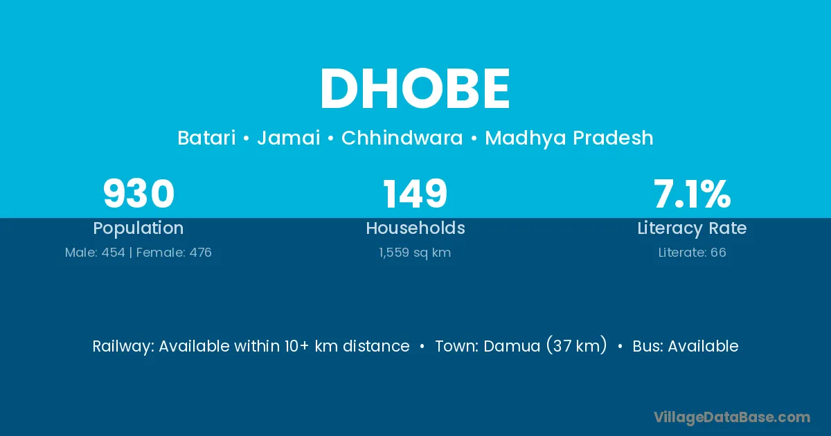 The literacy rate of Dhobe village is 12.72%. Male literacy stands at 12.64% and female literacy at 12.79%.