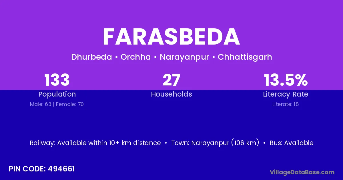 Narayanpur (106 km) is the nearest town to Farasbeda village for major economic activities and is located approximately 106 km away.