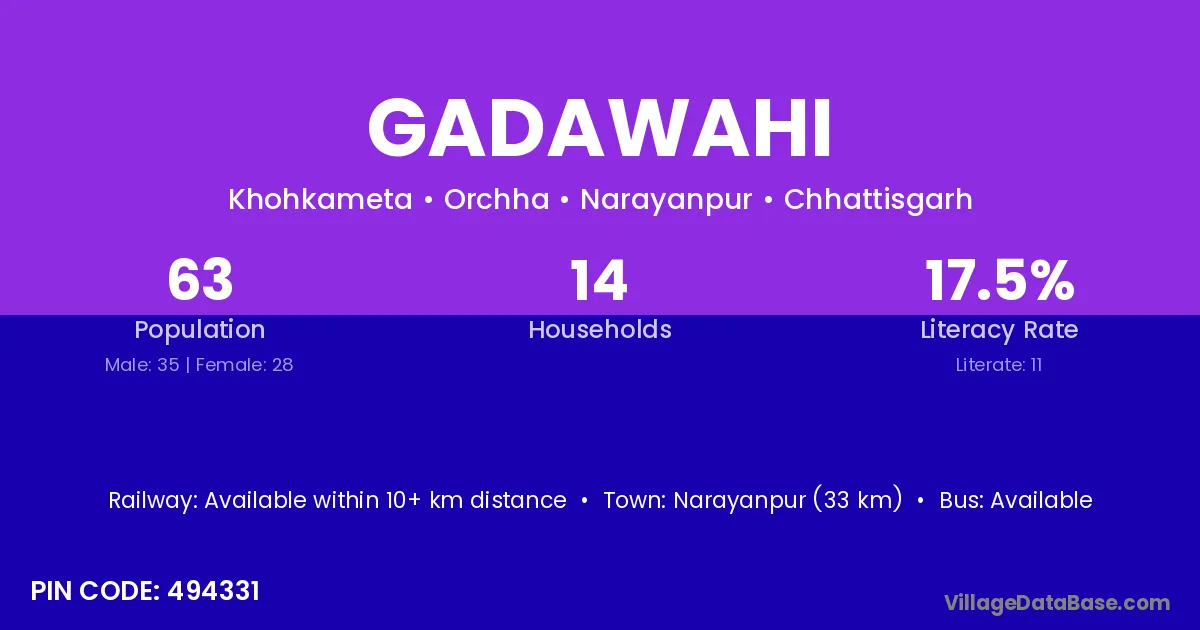 Narayanpur (33 km) is the nearest town to Gadawahi village for major economic activities and is located approximately 33 km away.