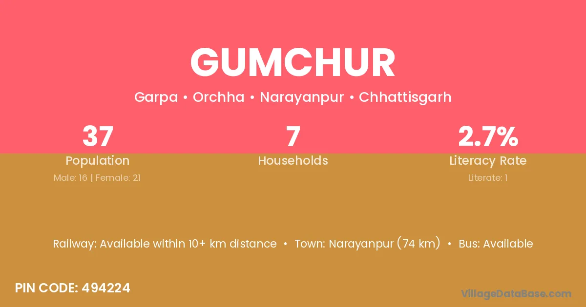 Narayanpur (74 km) is the nearest town to Gumchur village for major economic activities and is located approximately 74 km away.