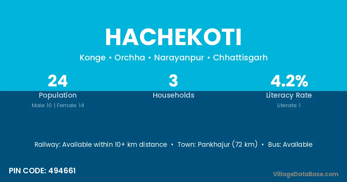 Hachekoti village has a total population of 24 people, of which 10 are males and 14 are females.