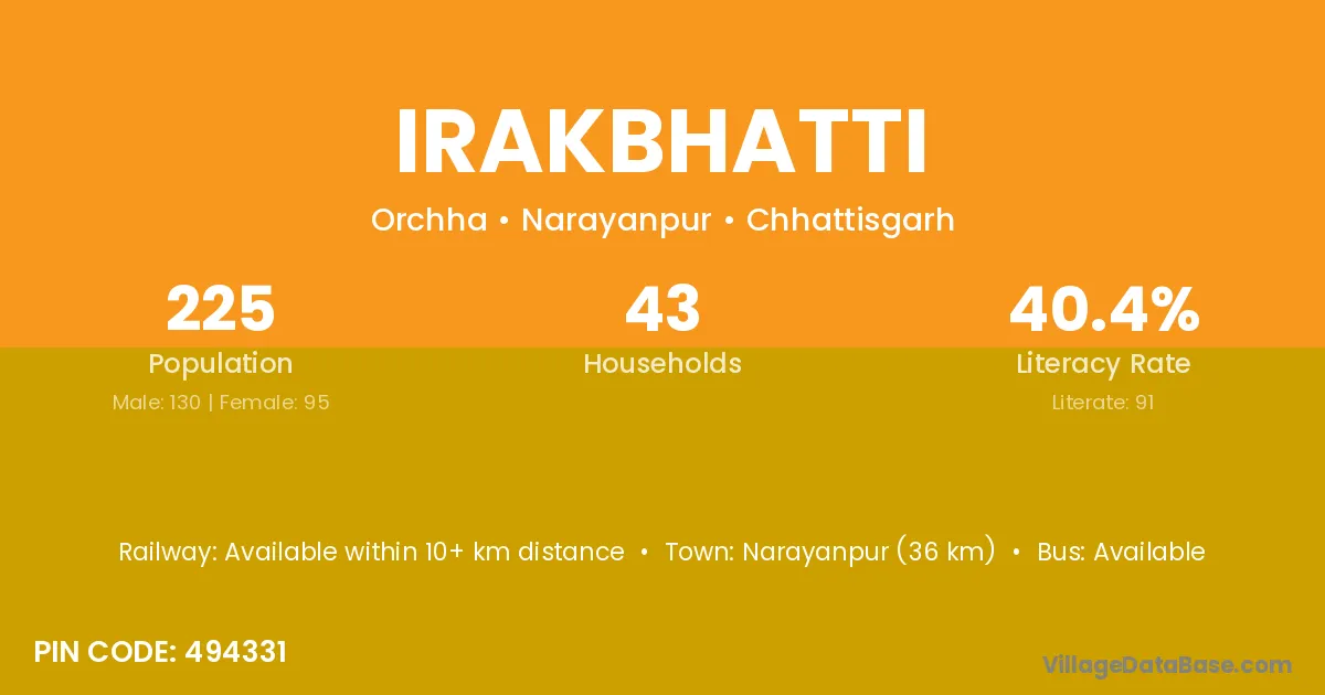 Narayanpur (36 km) is the nearest town to Irakbhatti village for major economic activities and is located approximately 36 km away.