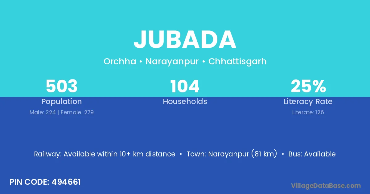 Narayanpur (81 km) is the nearest town to Jubada village for major economic activities and is located approximately 81 km away.