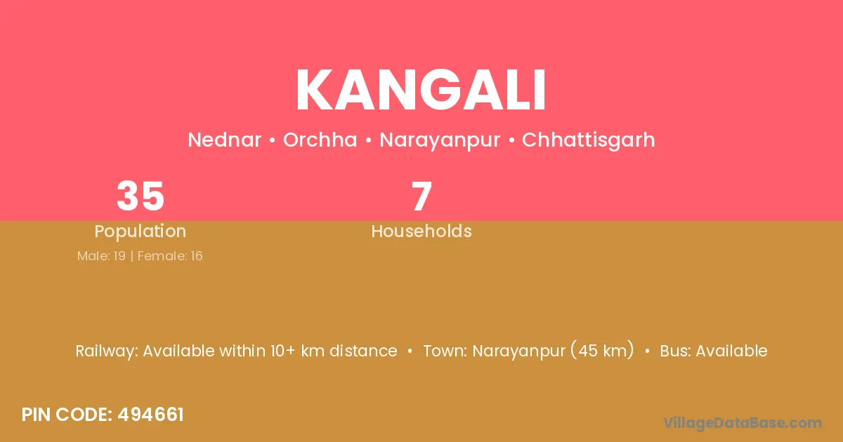 Narayanpur (45 km) is the nearest town to Kangali village for major economic activities and is located approximately 45 km away.