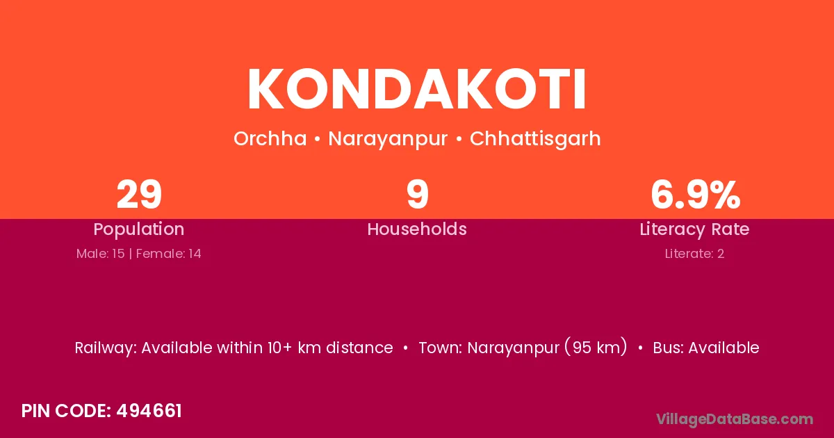 Kondakoti village has a total population of 29 people, of which 15 are males and 14 are females.