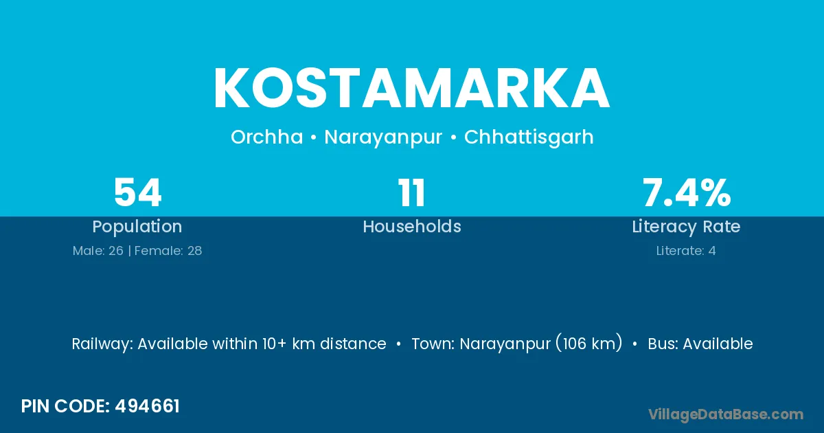 Narayanpur (106 km) is the nearest town to Kostamarka village for major economic activities and is located approximately 106 km away.