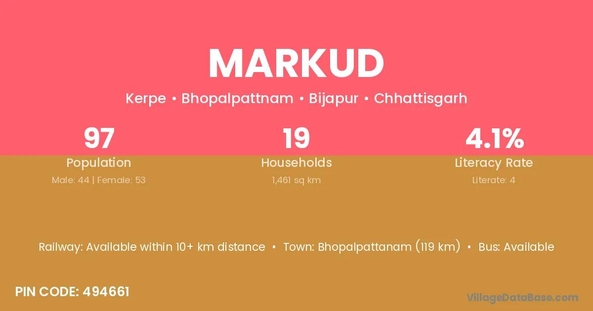 Narayanpur (48 km) is the nearest town to Markud village for major economic activities and is located approximately 48 km away.