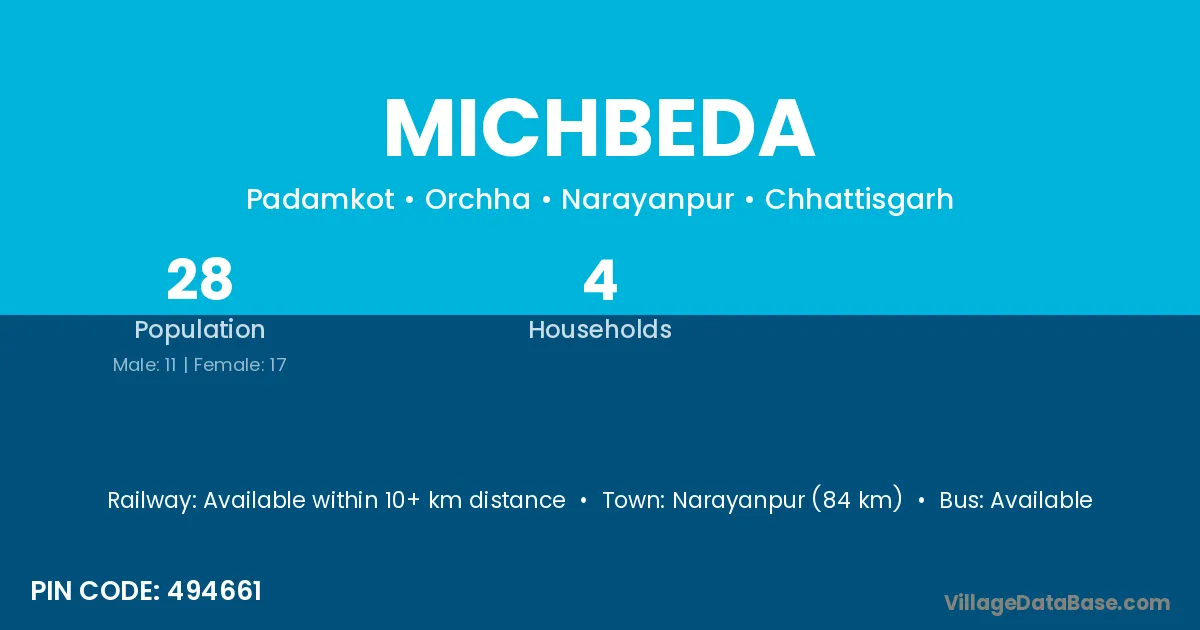 Narayanpur (84 km) is the nearest town to Michbeda village for major economic activities and is located approximately 84 km away.