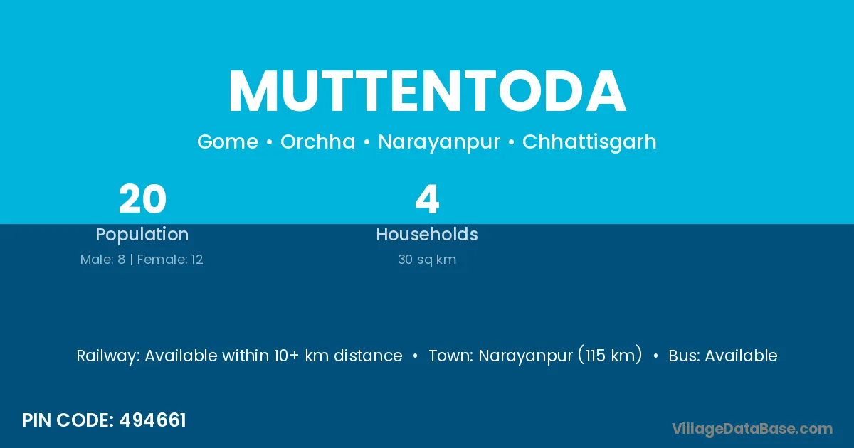 Narayanpur (115 km) is the nearest town to Muttentoda village for major economic activities and is located approximately 115 km away.