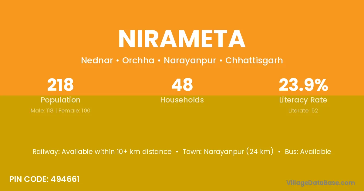 Narayanpur (24 km) is the nearest town to Nirameta village for major economic activities and is located approximately 24 km away.