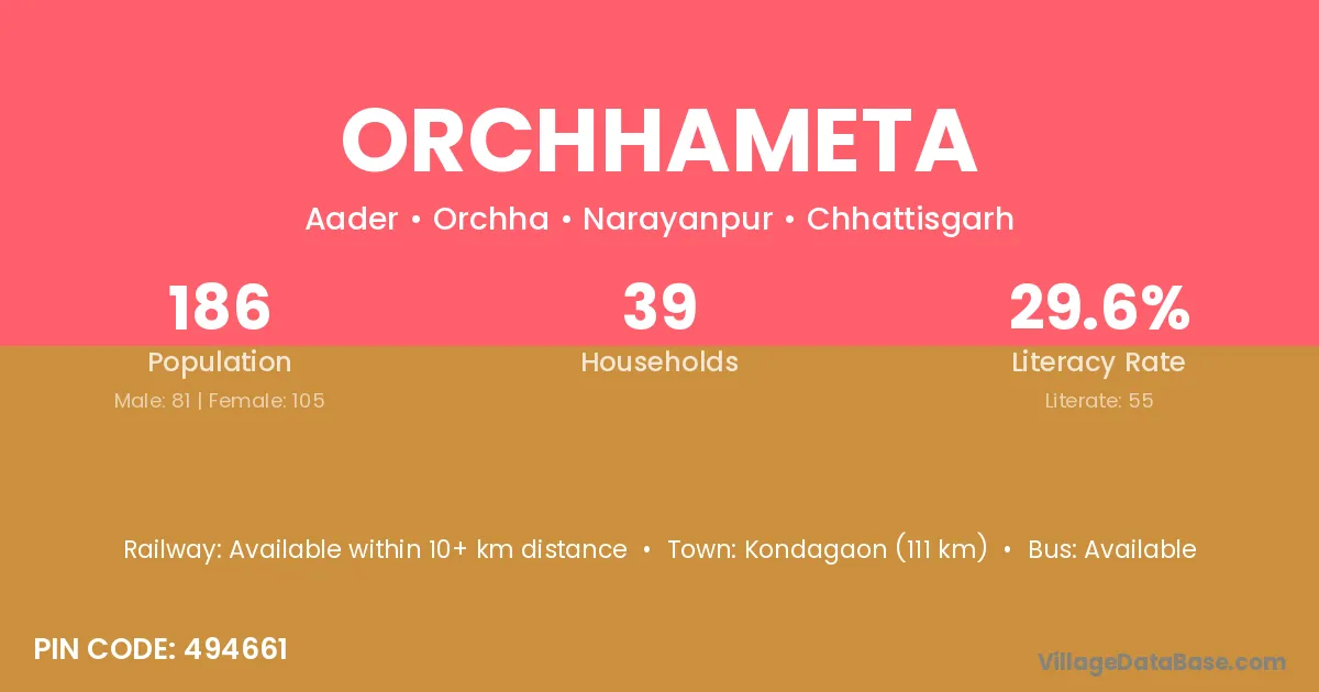 Kondagaon (111 km) is the nearest town to Orchhameta village for major economic activities and is located approximately 111 km away.
