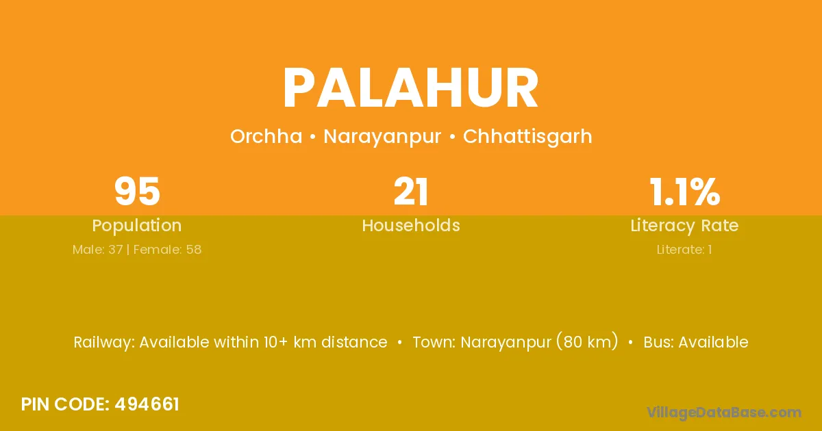 Narayanpur (80 km) is the nearest town to Palahur village for major economic activities and is located approximately 80 km away.