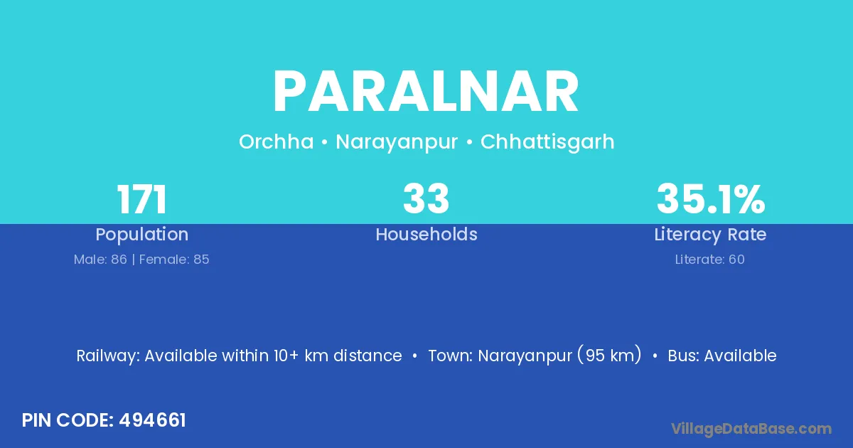 Narayanpur (95 km) is the nearest town to Paralnar village for major economic activities and is located approximately 95 km away.