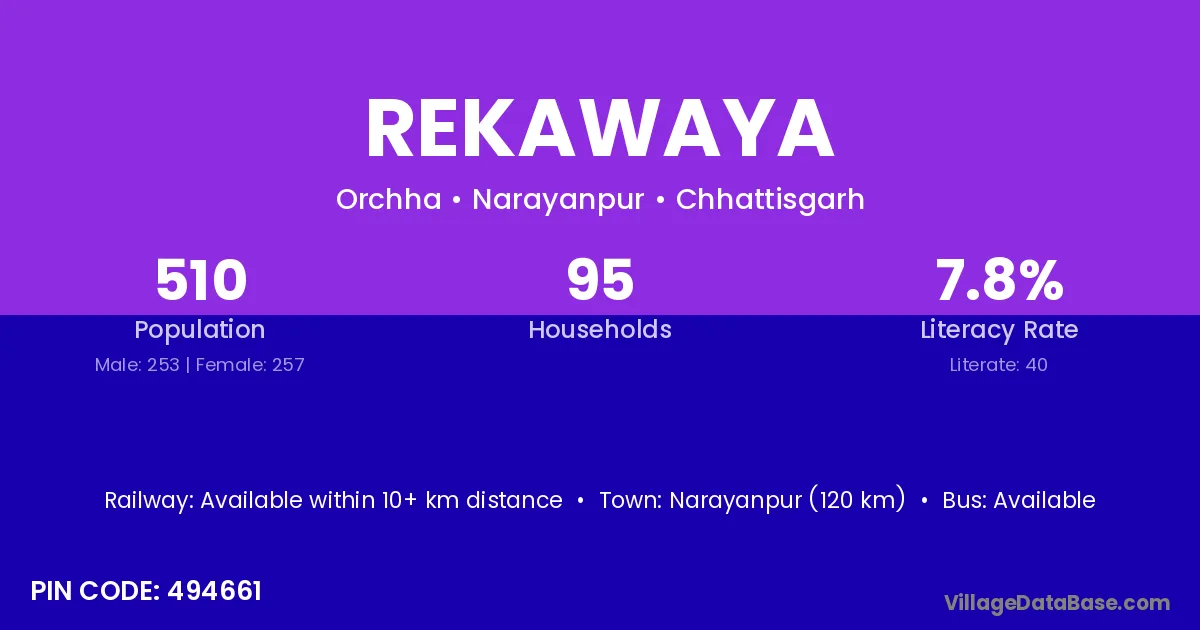 Narayanpur (120 km) is the nearest town to Rekawaya village for major economic activities and is located approximately 120 km away.