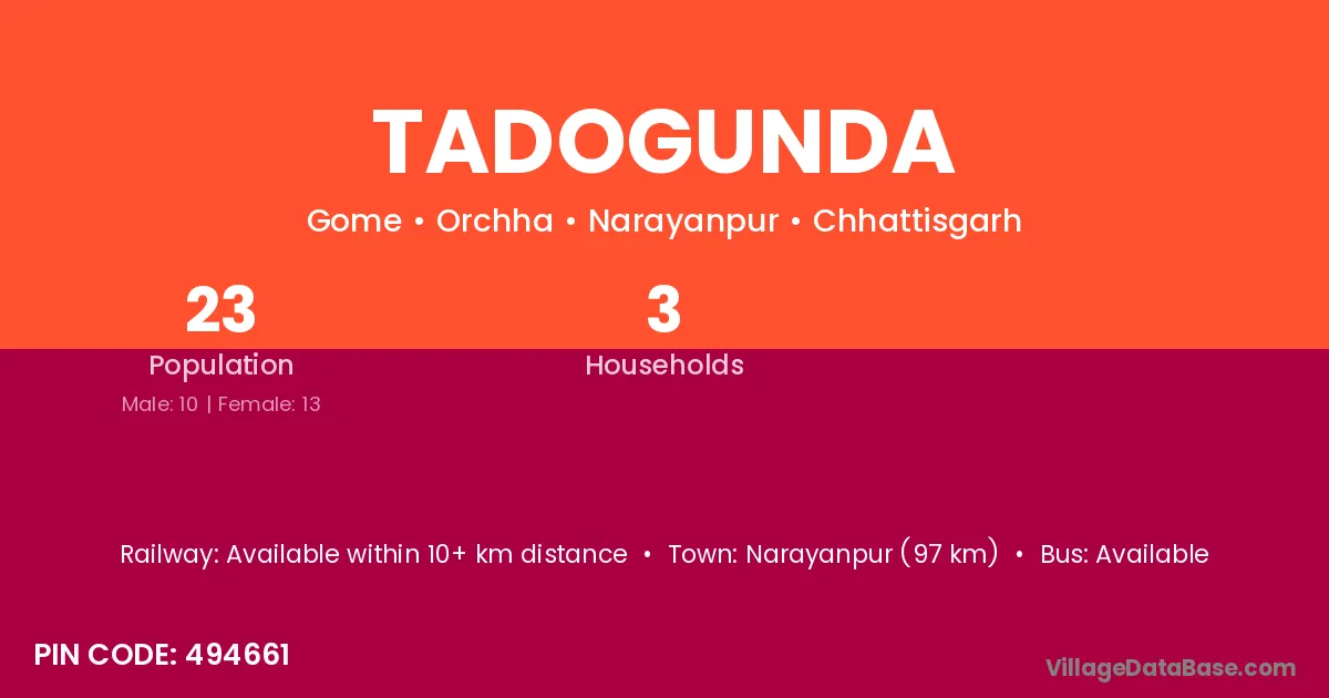 Narayanpur (97 km) is the nearest town to Tadogunda village for major economic activities and is located approximately 97 km away.