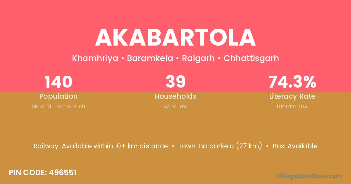 Baramkela (27 km) is the nearest town to Akabartola village for major economic activities and is located approximately 27 km away.