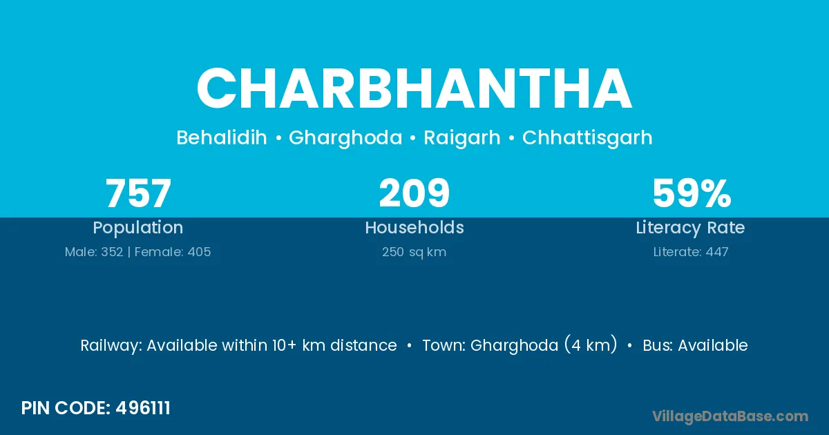 Baramkela (14 km) is the nearest town to Charbhantha village for major economic activities and is located approximately 14 km away.