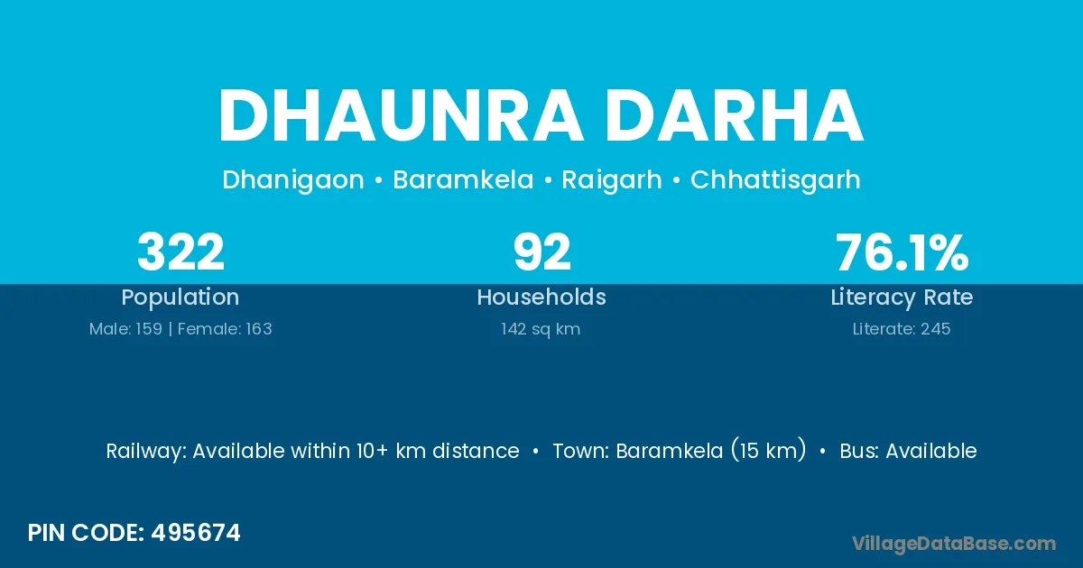 Baramkela (15 km) is the nearest town to Dhaunra Darha village for major economic activities and is located approximately 15 km away.