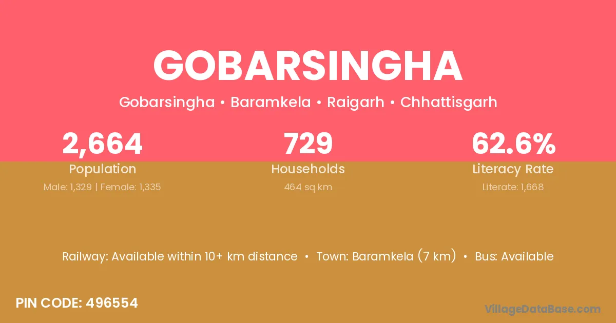 Baramkela (7 km) is the nearest town to Gobarsingha village for major economic activities and is located approximately 7 km away.