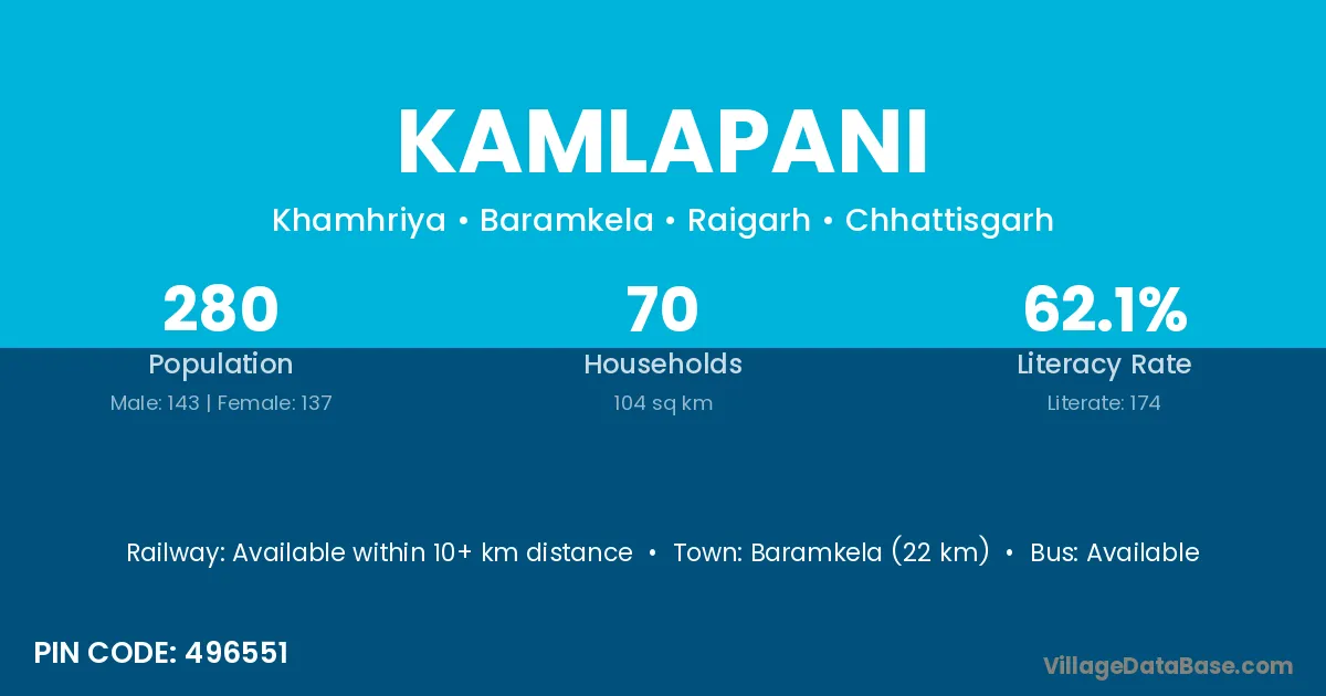 Baramkela (22 km) is the nearest town to Kamlapani village for major economic activities and is located approximately 22 km away.