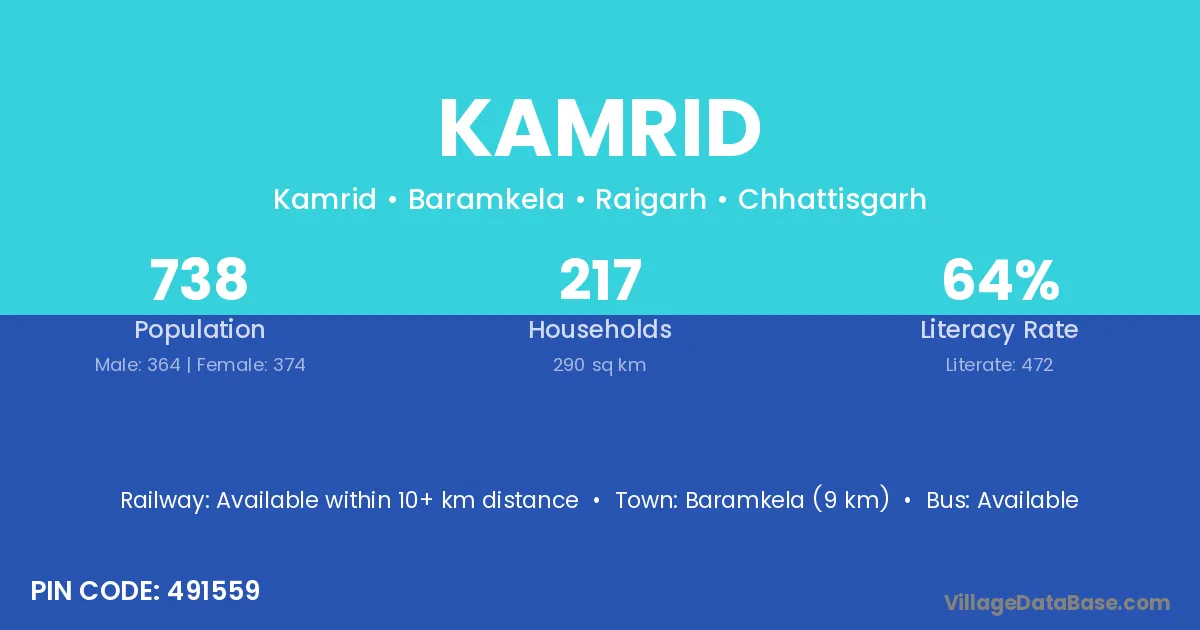 Kamrid village has a total population of 738 people, of which 364 are males and 374 are females.