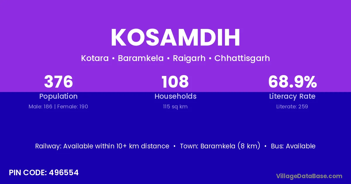 Baramkela (8 km) is the nearest town to Kosamdih village for major economic activities and is located approximately 8 km away.