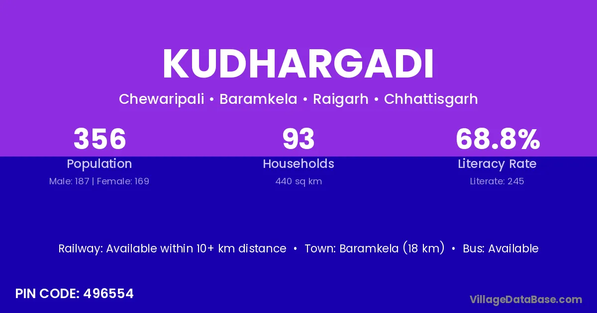 Baramkela (18 km) is the nearest town to Kudhargadi village for major economic activities and is located approximately 18 km away.