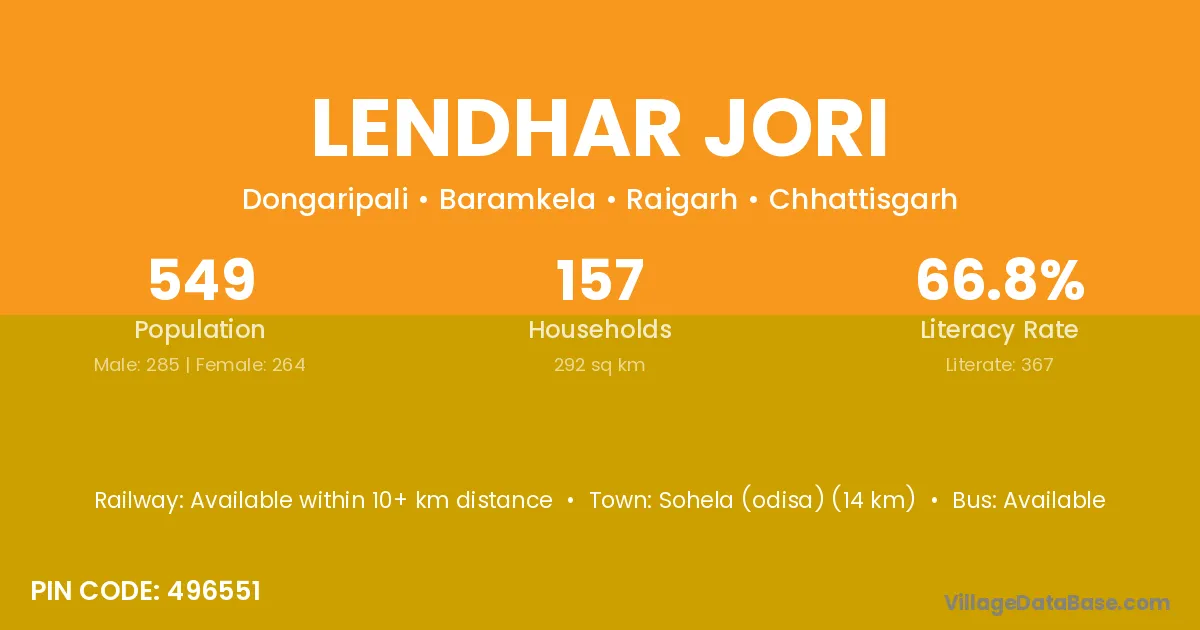 Sohela (odisa) (14 km) is the nearest town to Lendhar Jori village for major economic activities and is located approximately 14 km away.