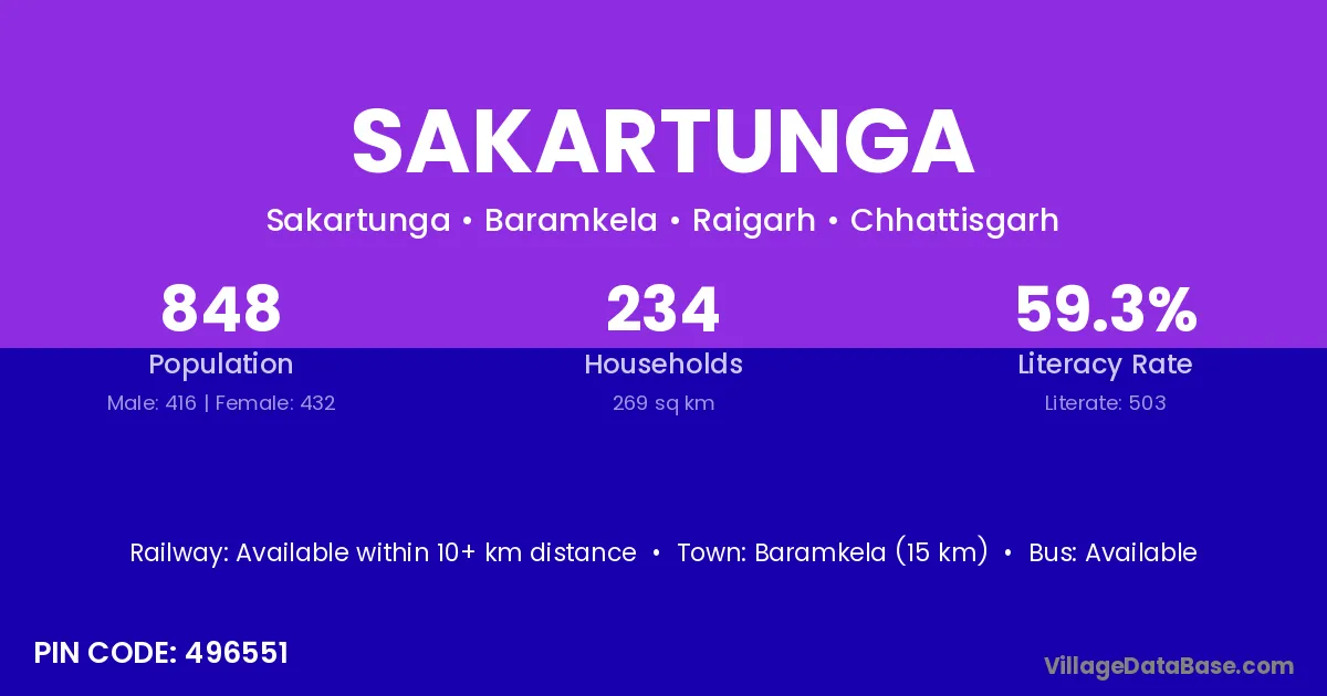 Sakartunga village has a total population of 848 people, of which 416 are males and 432 are females.