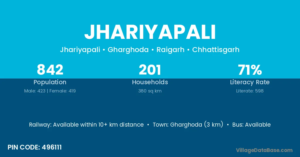 Gharghoda (3 km) is the nearest town to Jhariyapali village for major economic activities and is located approximately 3 km away.