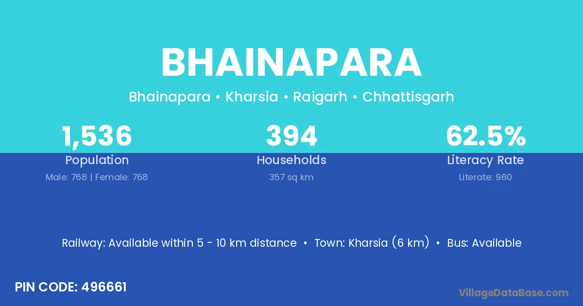 Kharsia (6 km) is the nearest town to Bhainapara village for major economic activities and is located approximately 6 km away.