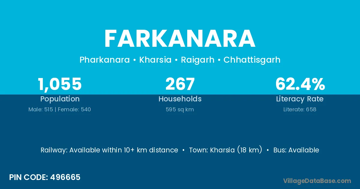 Kharsia (18 km) is the nearest town to Farkanara village for major economic activities and is located approximately 18 km away.