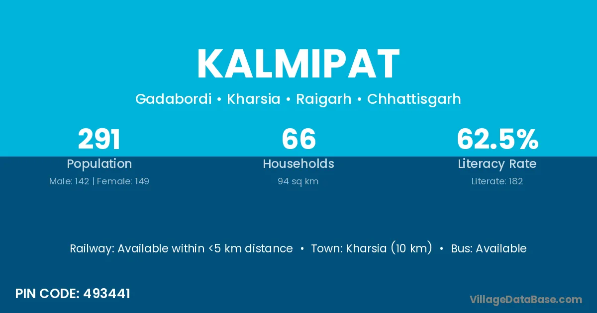 Kharsia (10 km) is the nearest town to Kalmipat village for major economic activities and is located approximately 10 km away.