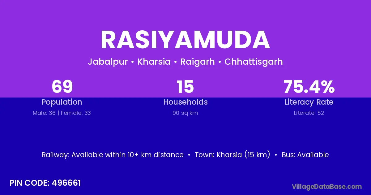 Kharsia (15 km) is the nearest town to Rasiyamuda village for major economic activities and is located approximately 15 km away.