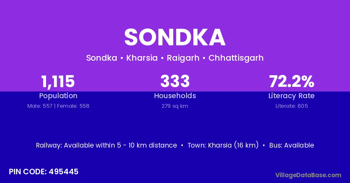 Kharsia (16 km) is the nearest town to Sondka village for major economic activities and is located approximately 16 km away.