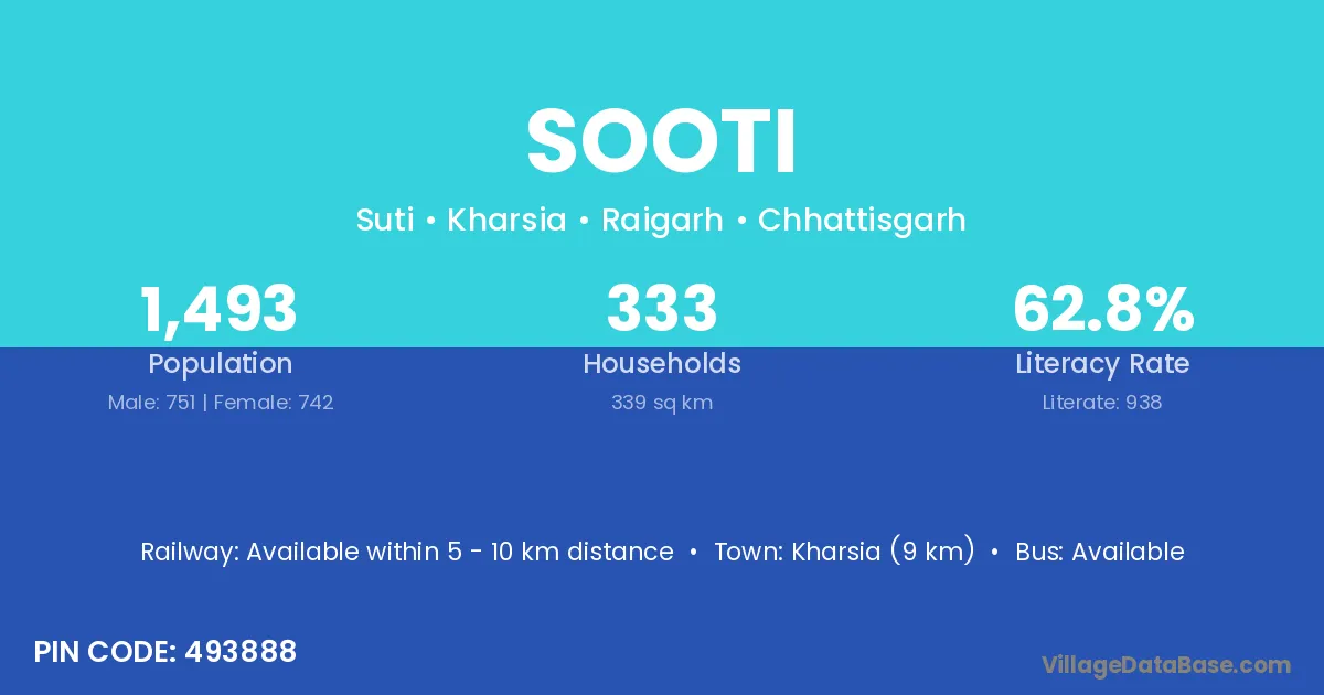 Kharsia (9 km) is the nearest town to Sooti village for major economic activities and is located approximately 9 km away.