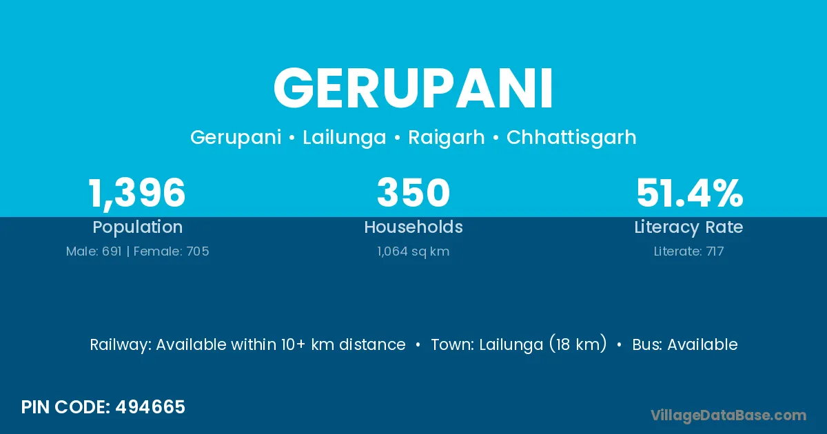 Lailunga (18 km) is the nearest town to Gerupani village for major economic activities and is located approximately 18 km away.