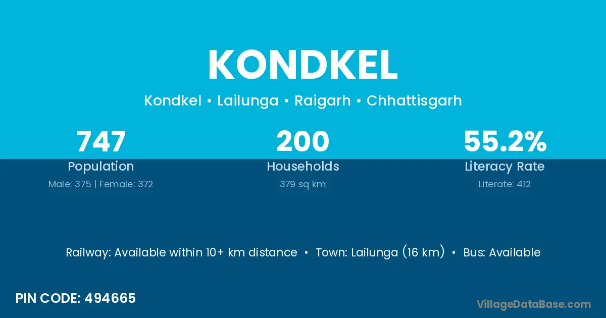 Kondkel village has a total population of 747 people, of which 375 are males and 372 are females.