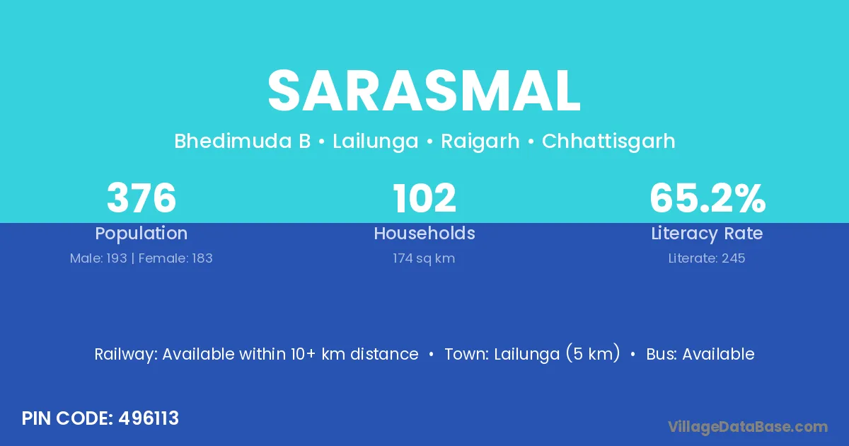 According to Census 2011 information, the village code of Sarasmal village is 496113.