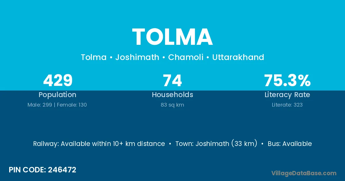 Lailunga (30 km) is the nearest town to Tolma village for major economic activities and is located approximately 30 km away.