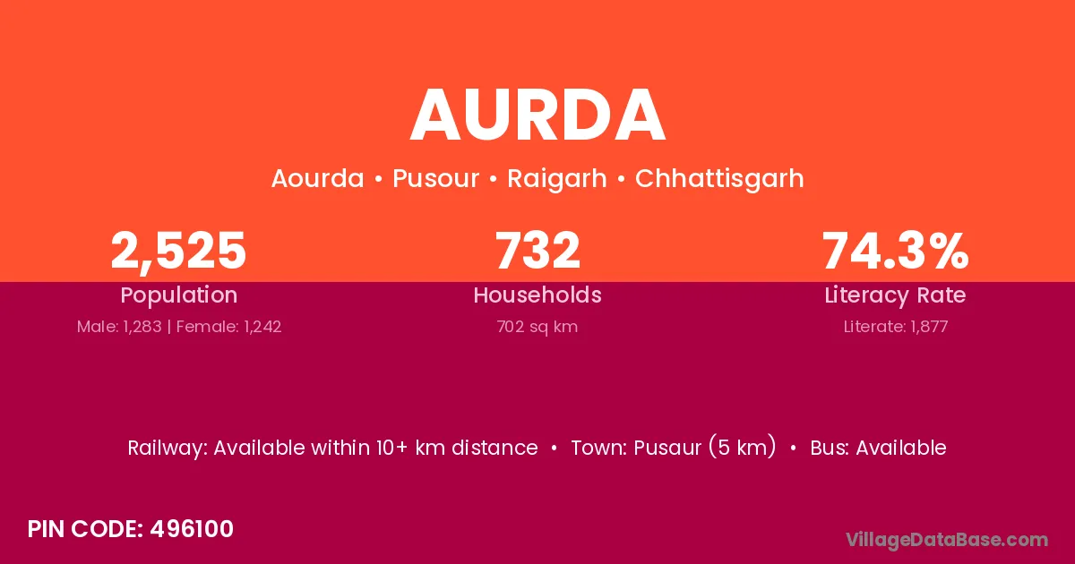 Aurda village is located in the Pusour Tehsil of the Raigarh district in Chhattisgarh .