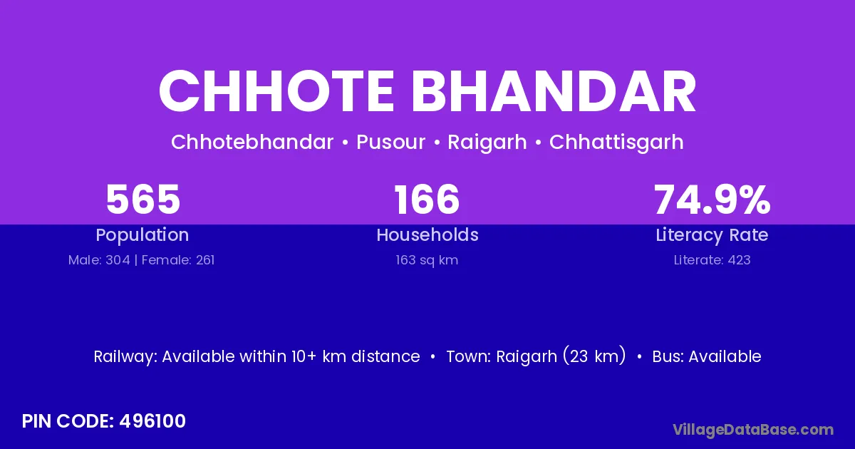 Raigarh (23 km) is the nearest town to Chhote Bhandar village for major economic activities and is located approximately 23 km away.
