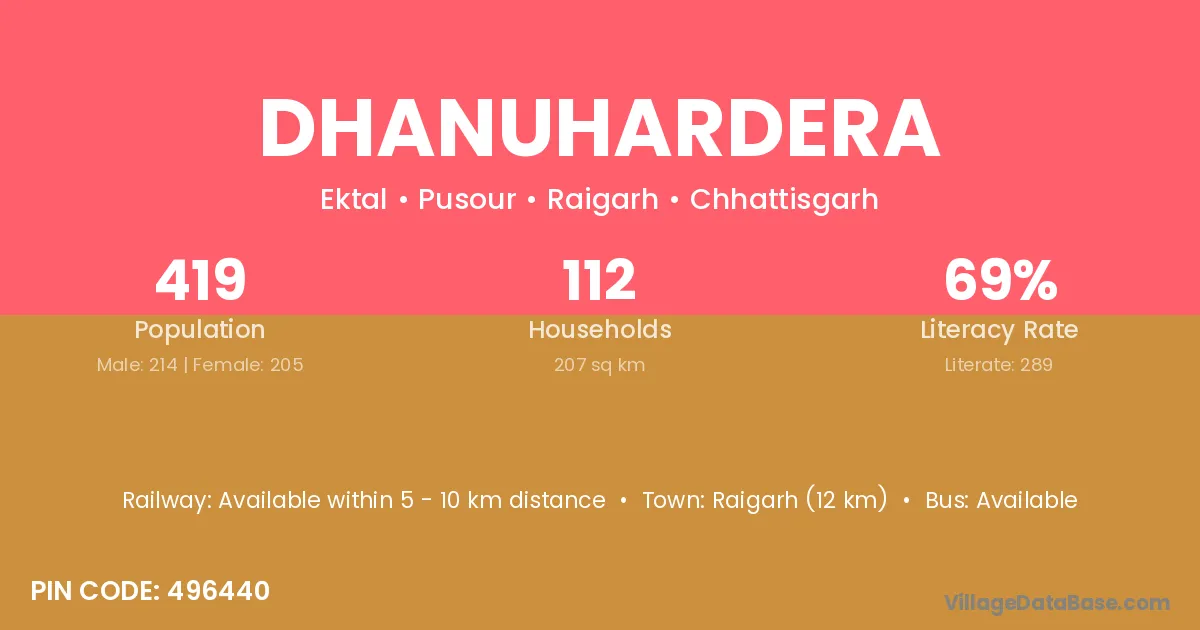 Raigarh (12 km) is the nearest town to Dhanuhardera village for major economic activities and is located approximately 12 km away.