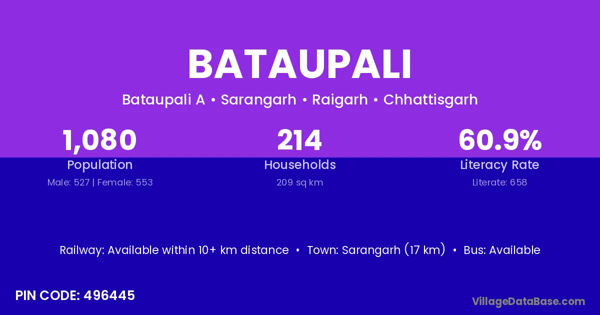 Sarangarh (17 km) is the nearest town to Bataupali village for major economic activities and is located approximately 17 km away.
