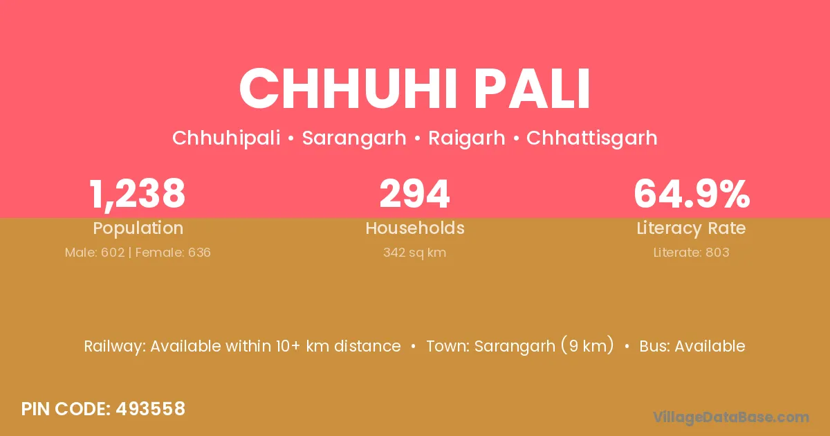 Chhuhi Pali village has a total population of 1,238 people, of which 602 are males and 636 are females.