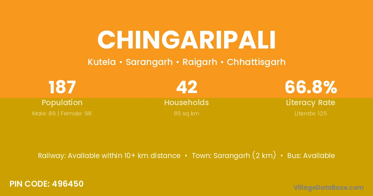 Sarangarh (2 km) is the nearest town to Chingaripali village for major economic activities and is located approximately 2 km away.