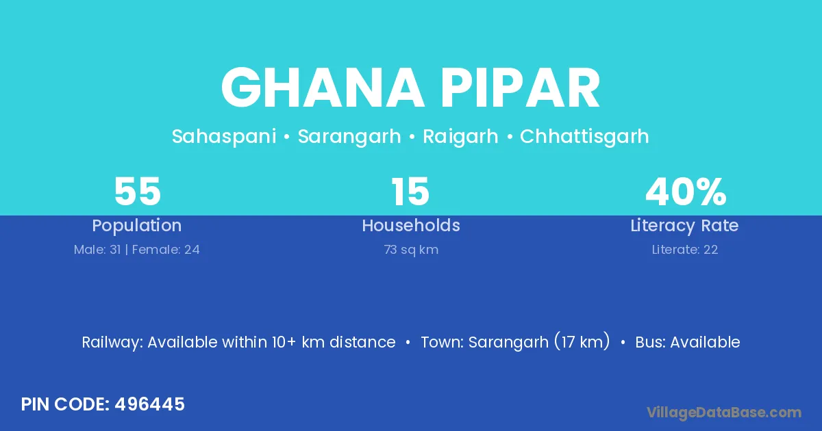 Sarangarh (17 km) is the nearest town to Ghana Pipar village for major economic activities and is located approximately 17 km away.